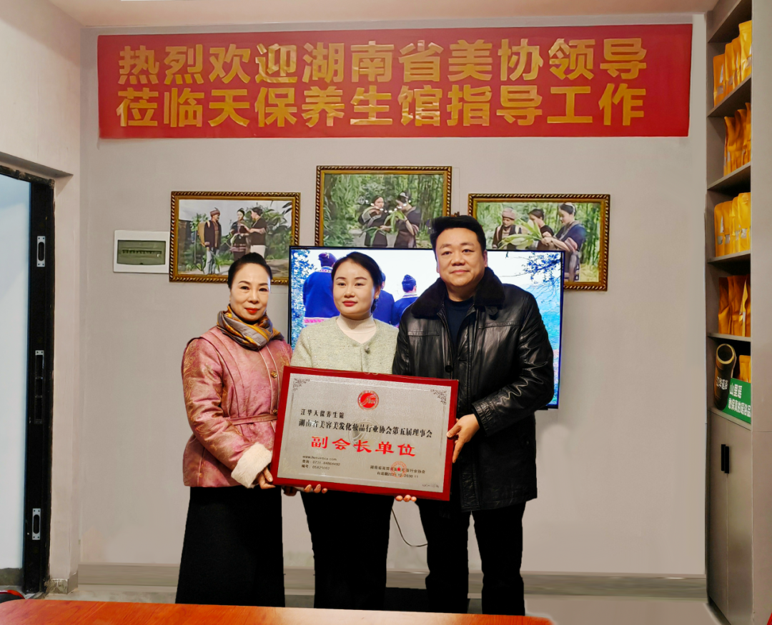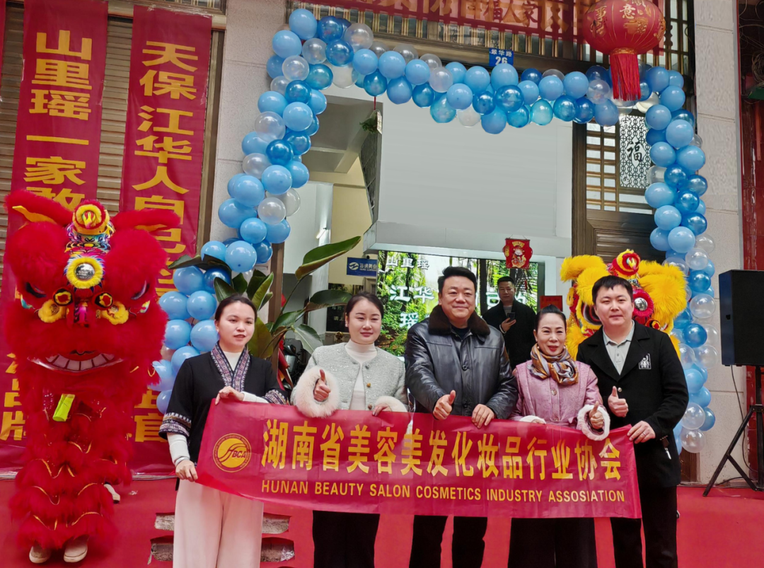 2026年1月20日上午,湖南省美容美发行业协会副会长单位——湖南江华艾米瑶生物科技有限公司天保养生馆新店开业庆典,在永州市江华瑶族自治县隆重举行。省协会会长刘勇、常务副会长欧阳清怡、副秘书长李鼎受邀出席,为新店剪彩并现场颁发“湖南省美容美发行业协会副会长单位”牌匾,共同见证这场植根瑶族文化、以瑶药瑶浴赋能美业升级的行业盛会。